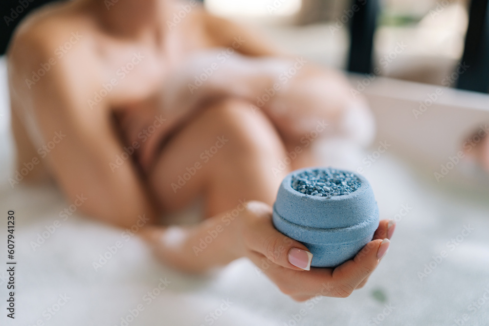 Close-up cropped shot of unrecognizable young woman sitting in foam bathtub holding bath bomb above water. Soap ball dissolving, foam bubbles. Concept of decorative cosmetic products for bathroom.