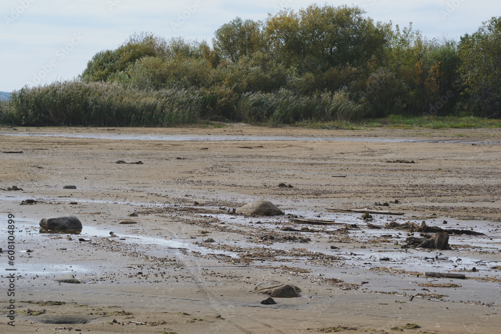 Drying bottom of the river against the background of a natural landscape - shore, trees, sky.