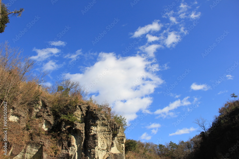 崖/上に木々が生えている、白っぽい崖の風景
