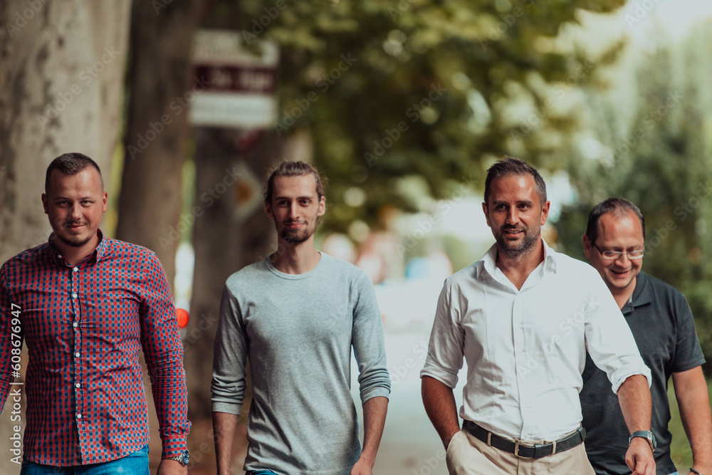 After a productive day at work, a group of diverse colleagues enjoy a leisurely stroll through a modern and natural urban setting