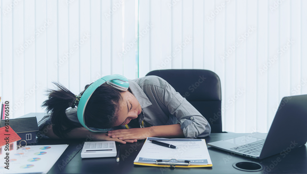 Exhausted and tired young adult office worker falling asleep on desk because of overtime work hours. Burnout fatigued company employee being sleepy and stressed because of huge work effort.