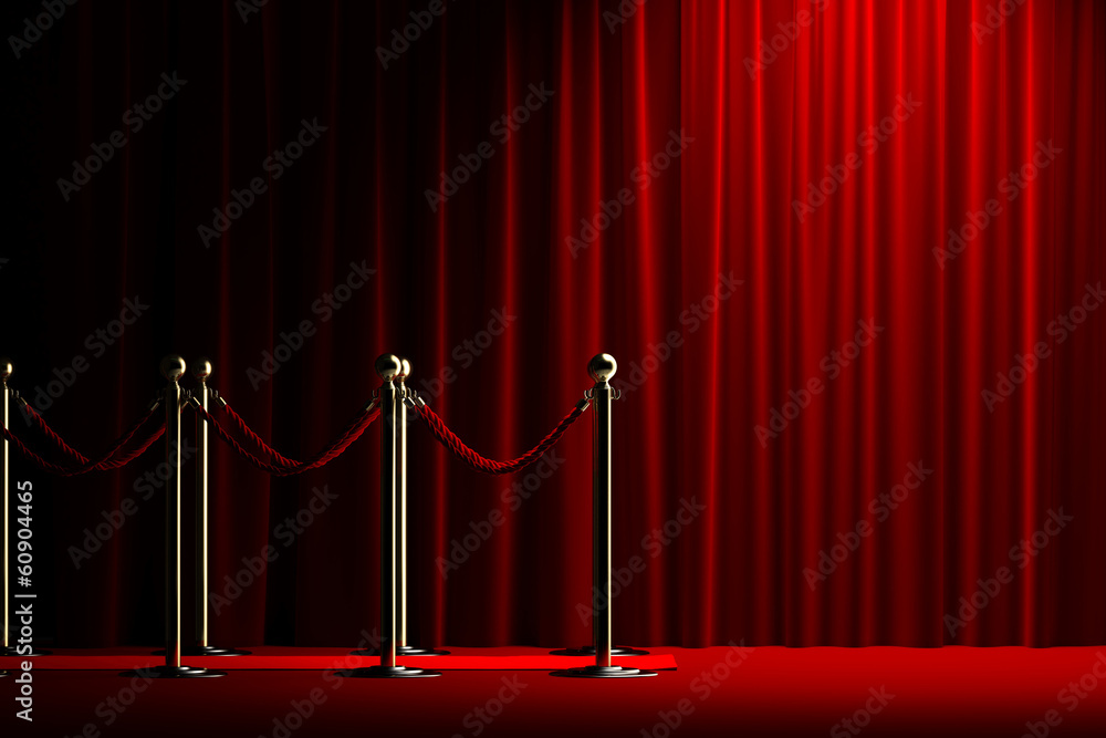 Rope barrier with red carpet and curtain