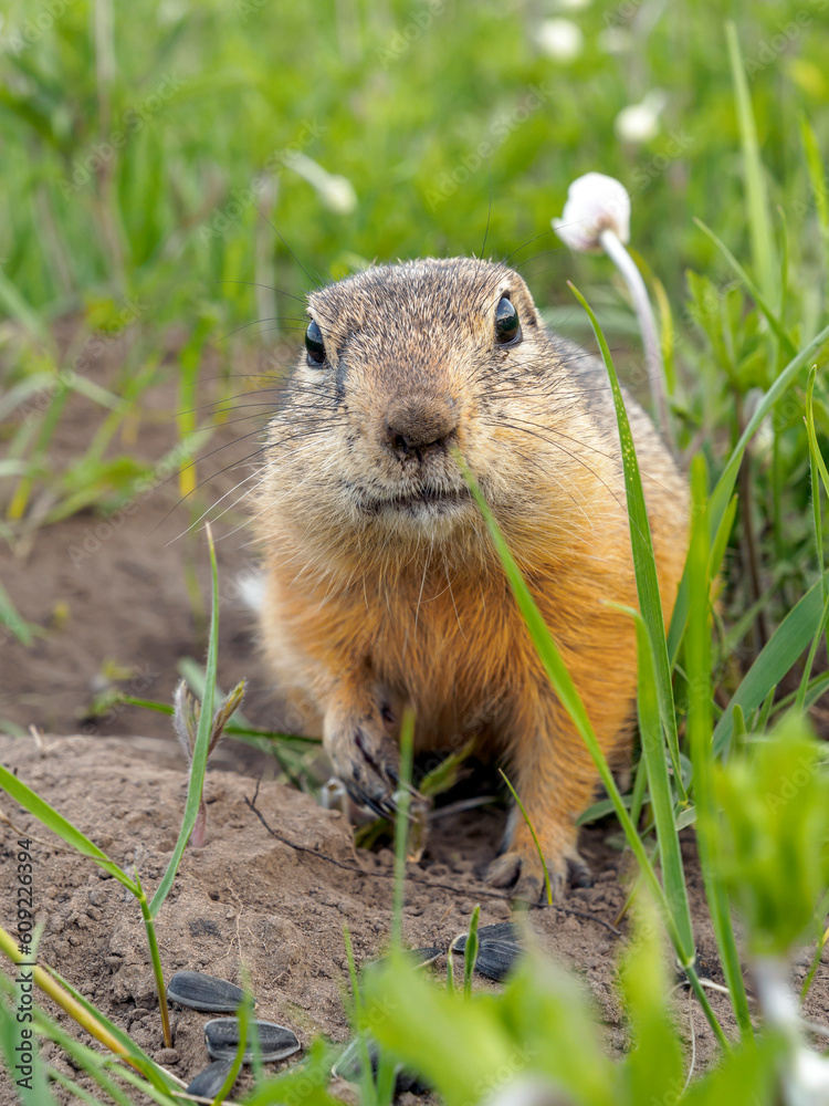 The prairie dog looking at a camera on a grassy lawn. Rodent portrait