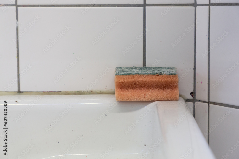 Ein Schwamm liegt zum Trocknen auf der Ecke eines Waschbeckens.