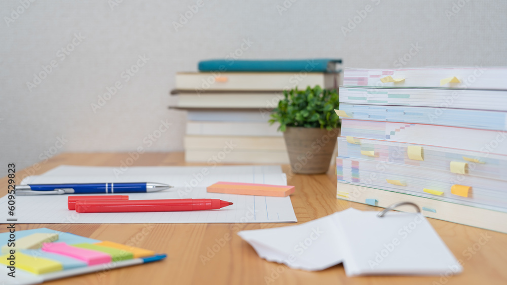 勉強イメージ│本・ノート・赤ペン・ふせん紙