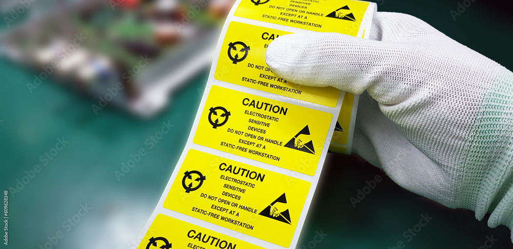 Hand holding ESD symbol label with antistatic gloves,Electrostatic Sensitive Devices (ESD) in electronic industrial.