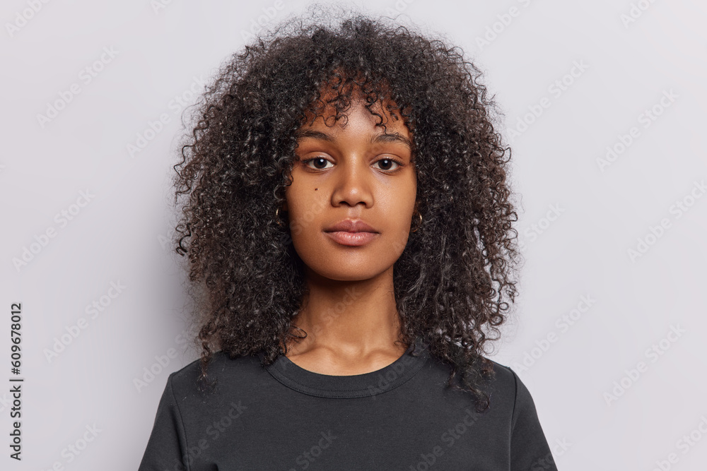 Portrait of serious curly haired teenage girl looks directly at camera has calm relaxed expression wears casual black t shirt isolated over white wall. Attractive female model poses for making photo
