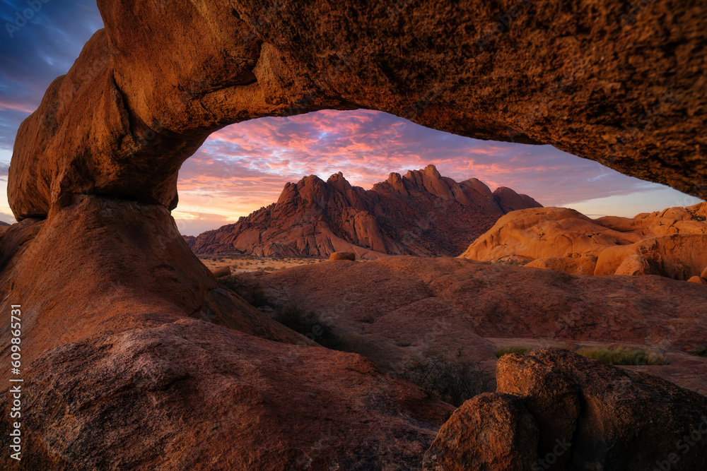 Dramatic sunset over Spitzkoppe, Namibia, Africa.
