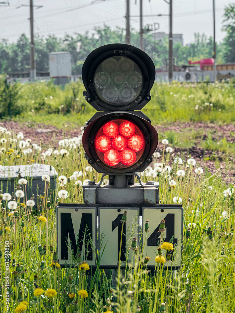 A dwarf railway traffic light with a red light on the Trans-Siberian railway. Sign stoplight