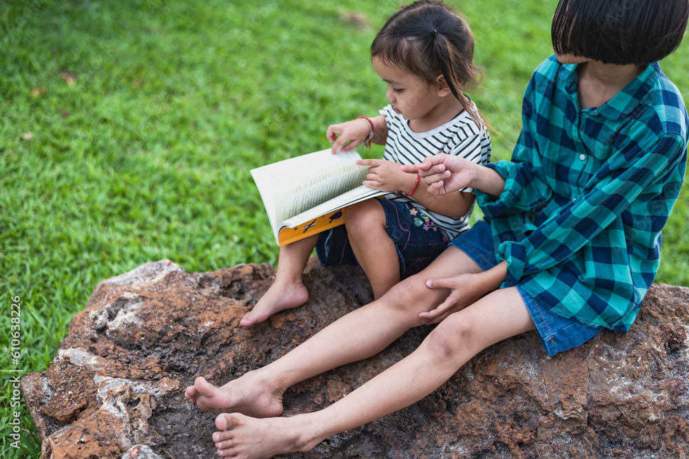 Sister and sister reading a book in the backyard Summer holidays, fairy tales, books and love. Brothers and sisters teach them to sit and read a book on the rocks in their backyard and relax together.