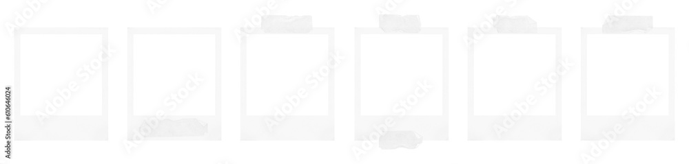 collection of polaroid photo frames with scotch tape strips on transparent background, tape strips with transparency, variety of realistic photo frames with adhesive tape pieces