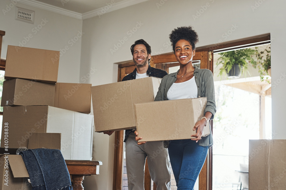 Happy couple, real estate and moving in property with boxes for renovation, investment or relocation. Excited interracial man or woman owner carrying box in move together or mortgage loan in new home