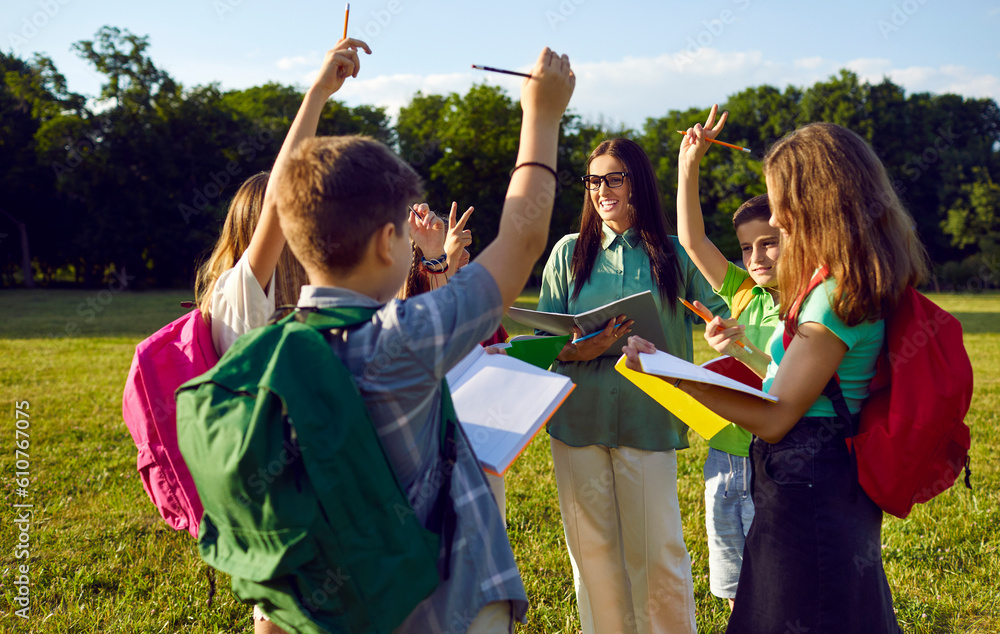 Happy school children having biology class outside. Group of classmates standing on green field, holding books and assignments, learning about nature, and raising hands to answer teacher's question