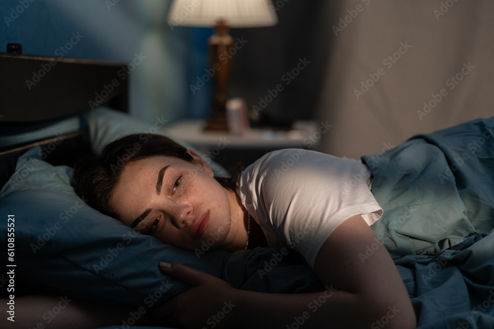 Young sad woman lying in bed late at night trying to sleep suffering insomnia. Girl in bed scared on nightmares looking worried and stressed. Sleeping disorder and insomnia