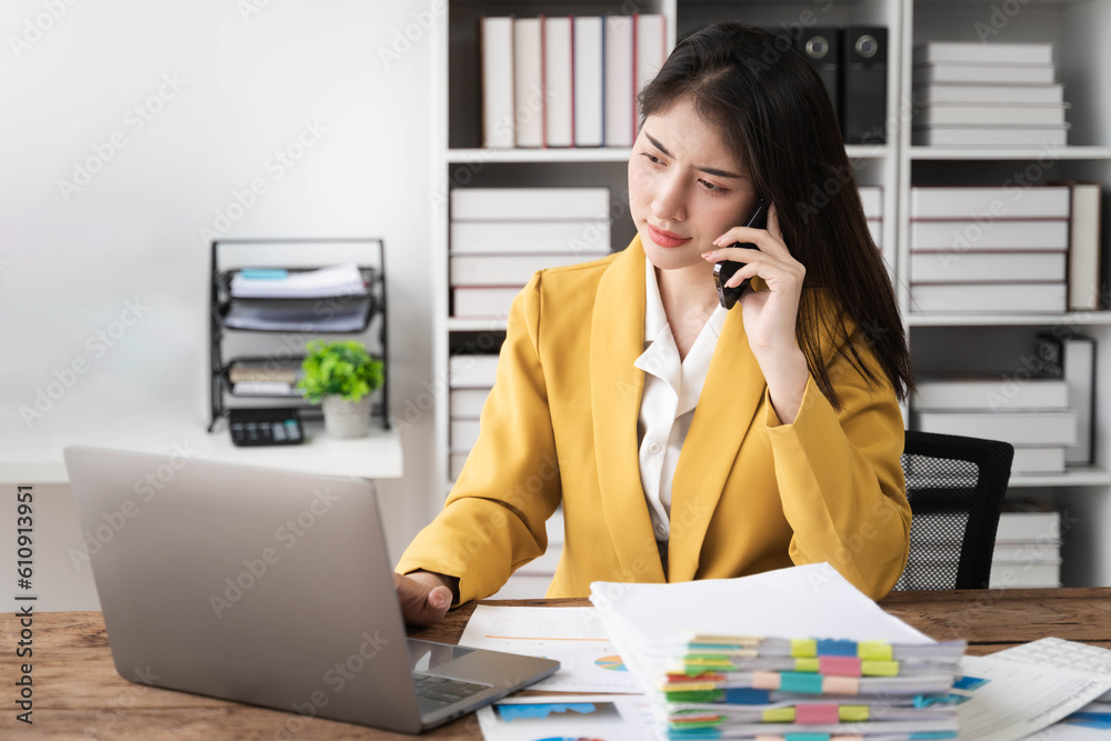 Busy business woman suffering stress working at laptop while talking on mobile phone in overwork. Tired businesswoman using phone.