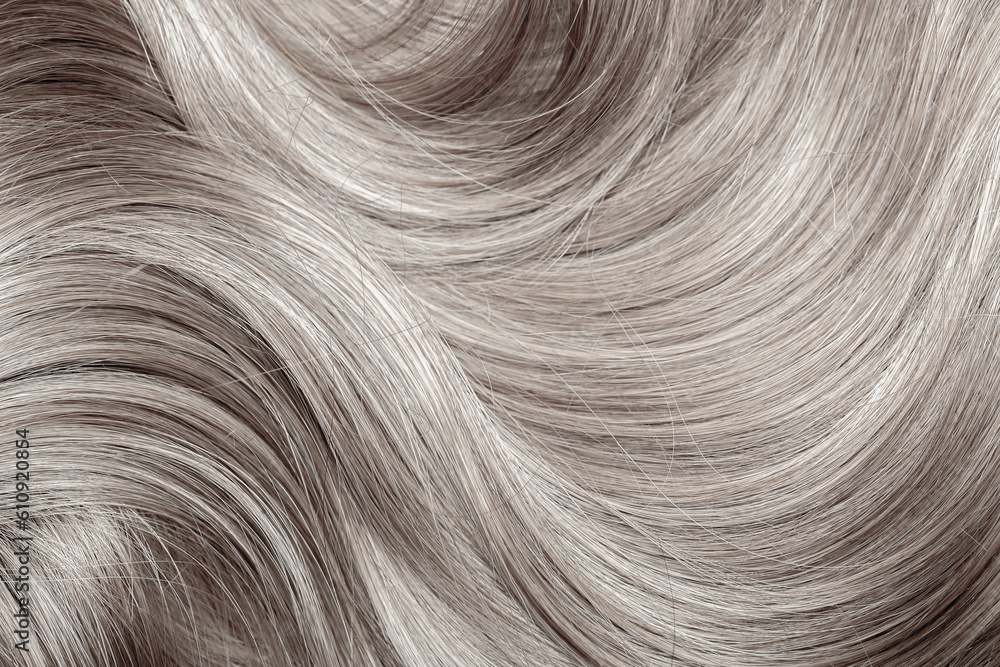 Blond hair close-up as a background. Women's long blonde hair. Beautifully styled wavy shiny curls. Hair coloring. Hairdressing procedures, extension. White hair