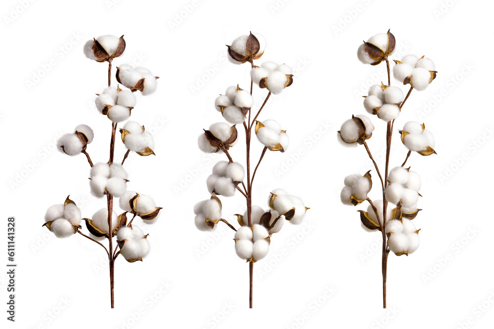 Set of cotton branches isolated on on transparent background. Delicate cotton flowers collection.