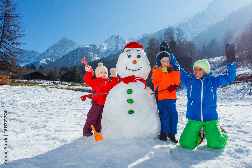 Three children play with snowman lift hands stand over mountains
