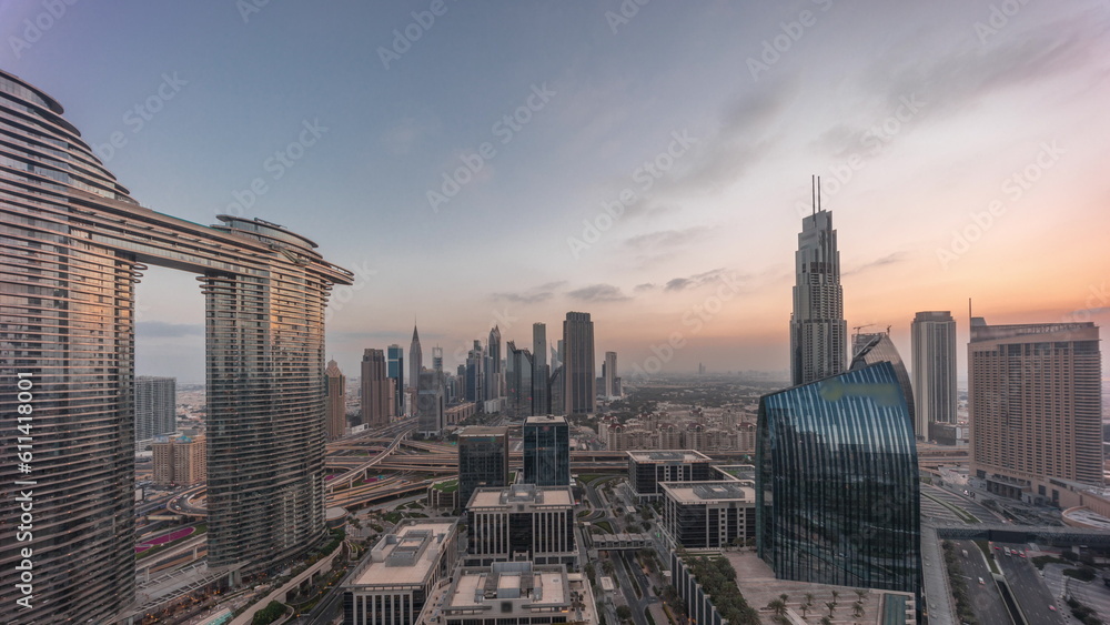 Futuristic Dubai Downtown and finansial district skyline aerial night to day timelapse.