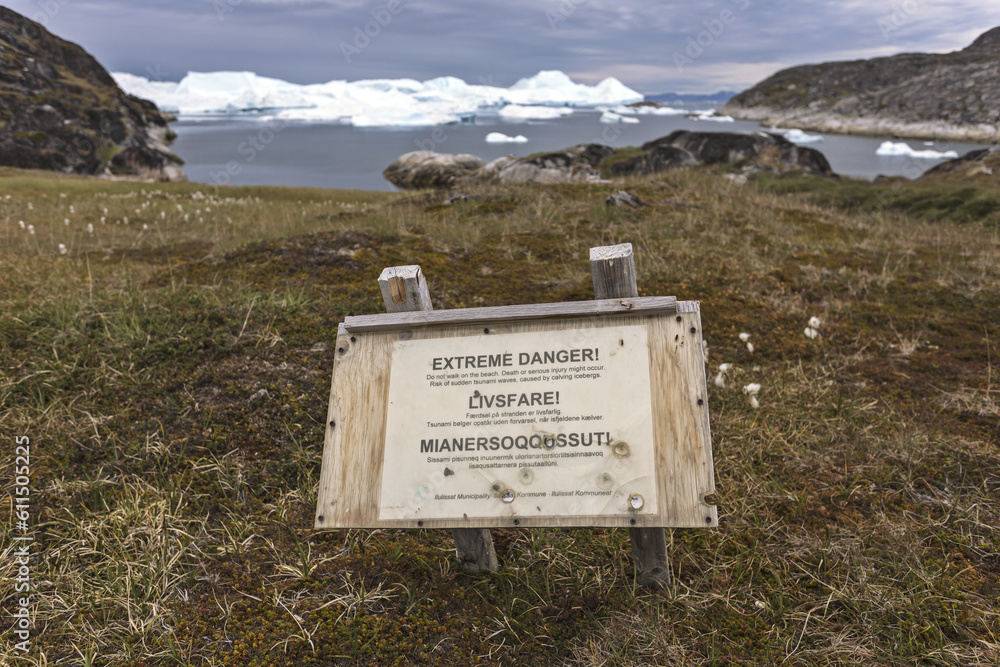 Warning sign about tsunami wave on the fjord shore in Greenland