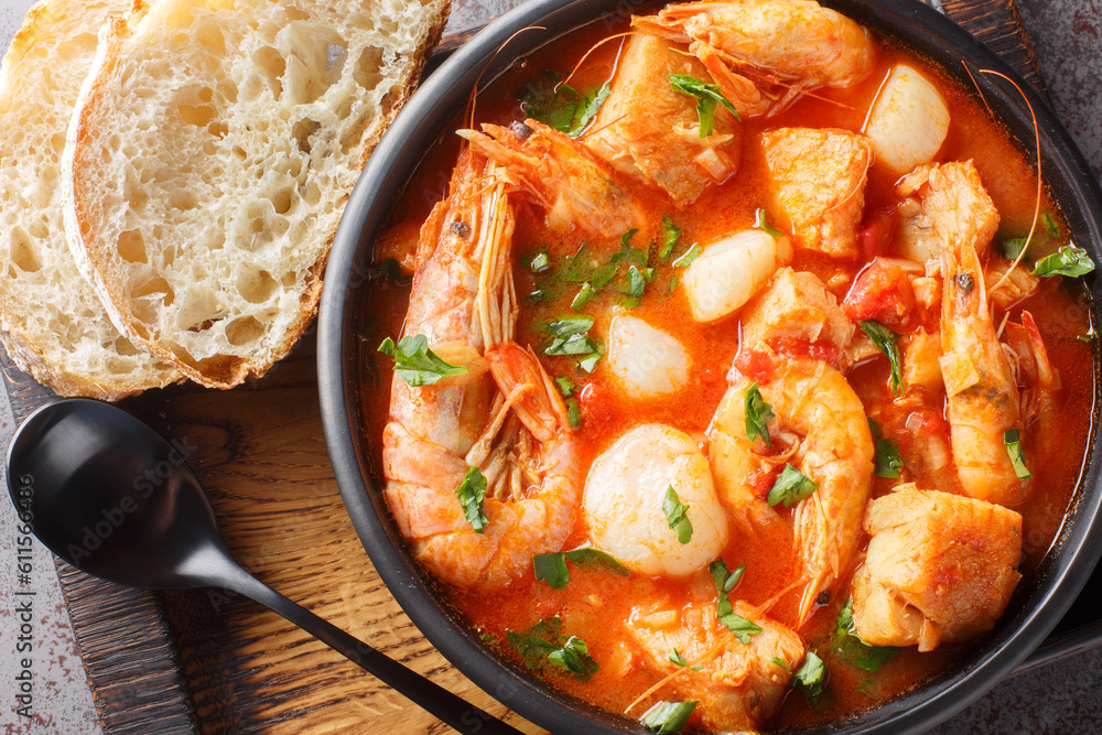 Seafood and fish stew such as shrimp, mussels, scallops, squid with tomatoes close-up in a bowl on the table. Horizontal top view from above