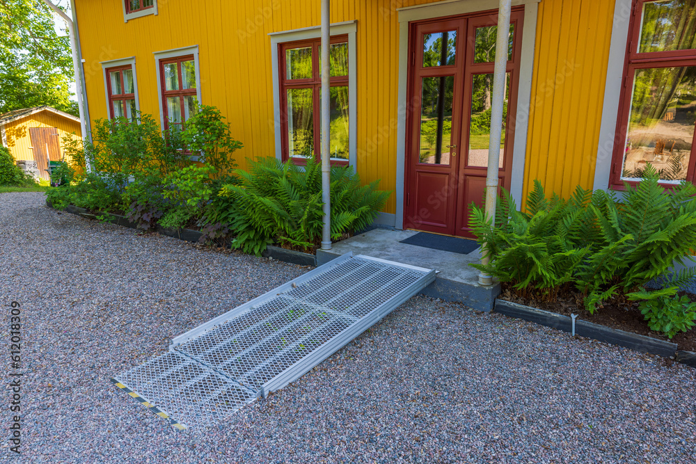 View of expanded metal wheelchair ramp infront of private house. Sweden.