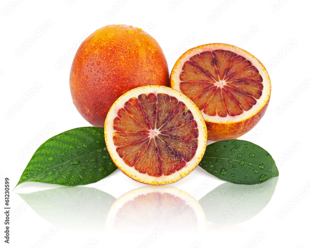 Blood oranges with cut and green leaves isolated on white backgr