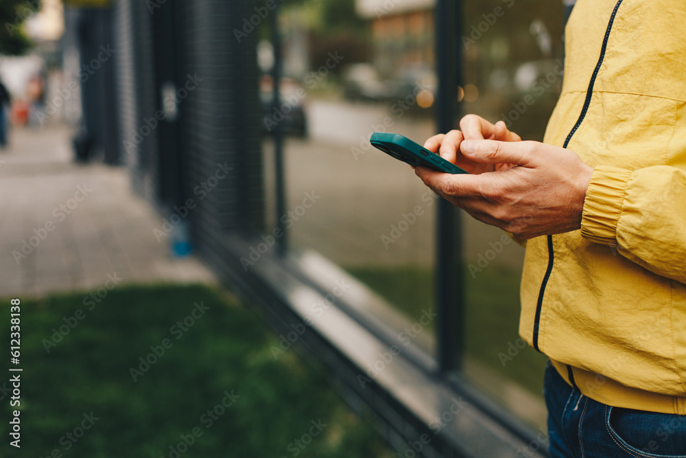 Man in yellow raincoat standing on the street with mobile phone and wireless earphones