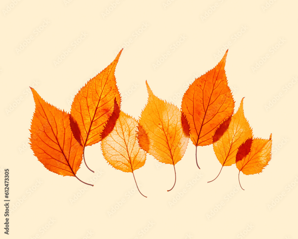Autumn leaves yellow orange gradient color on beige background. Natural fallen autumn leaves of elderberry as minimal card, vibrant color textured foliage, trend botanical still life
