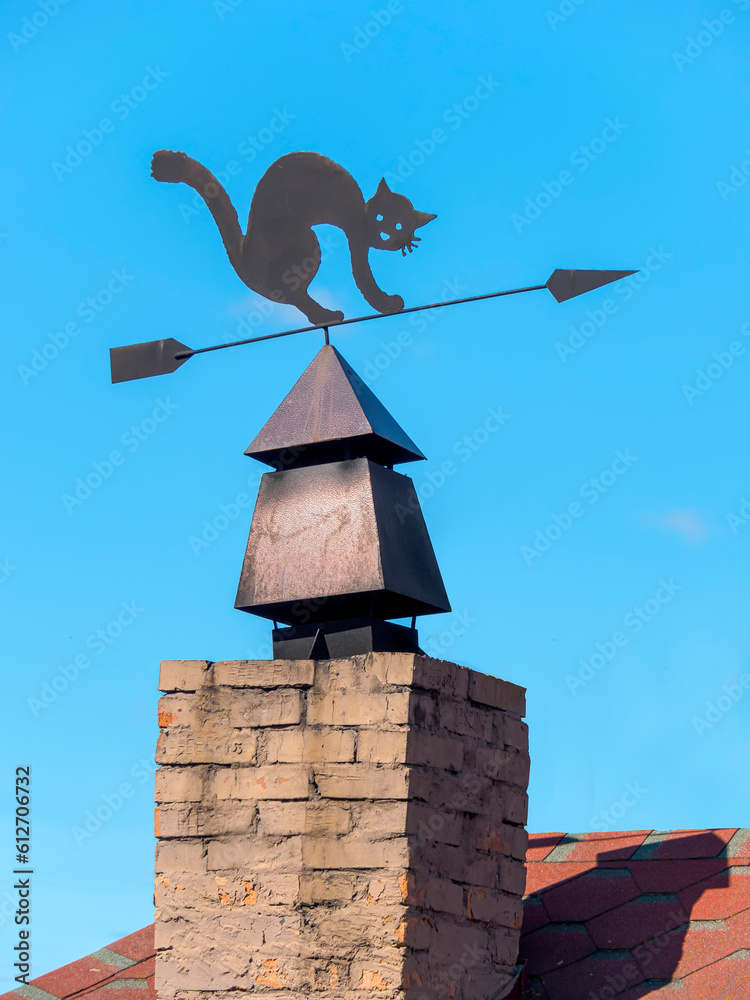 Weathervane on the roof of the house in the form of a cat against the blue sky.