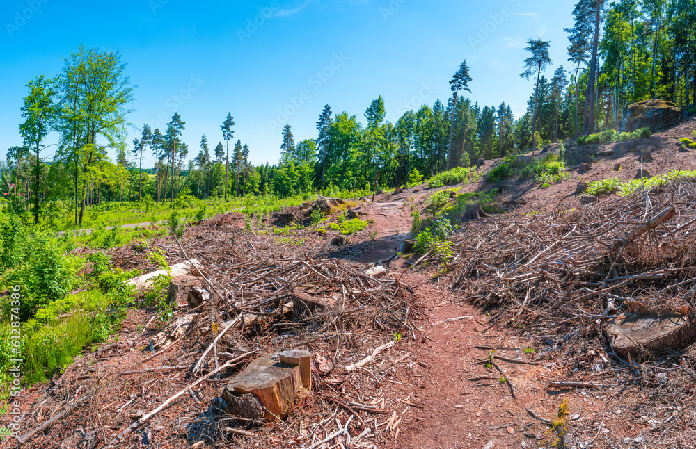 Dead and cut spruce forest, with spruce trees infested with bark eating beetles in the national park Saxon Switzerland, near Bad Schandau, Germany.