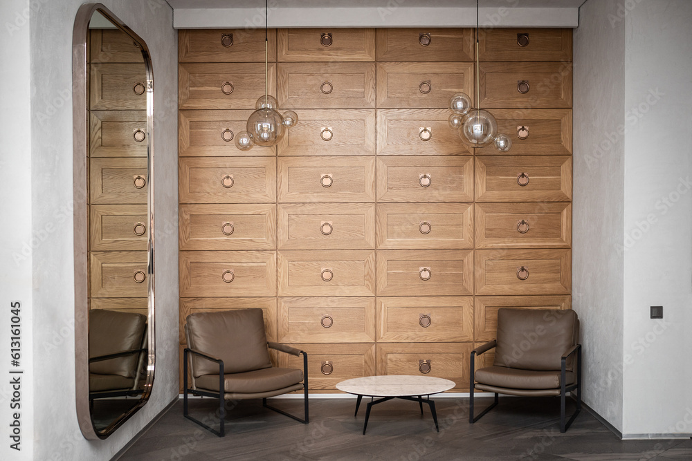 Modern waiting area interior in a mini hotel with a coffee table and two armchairs, hostel lobby interior.
