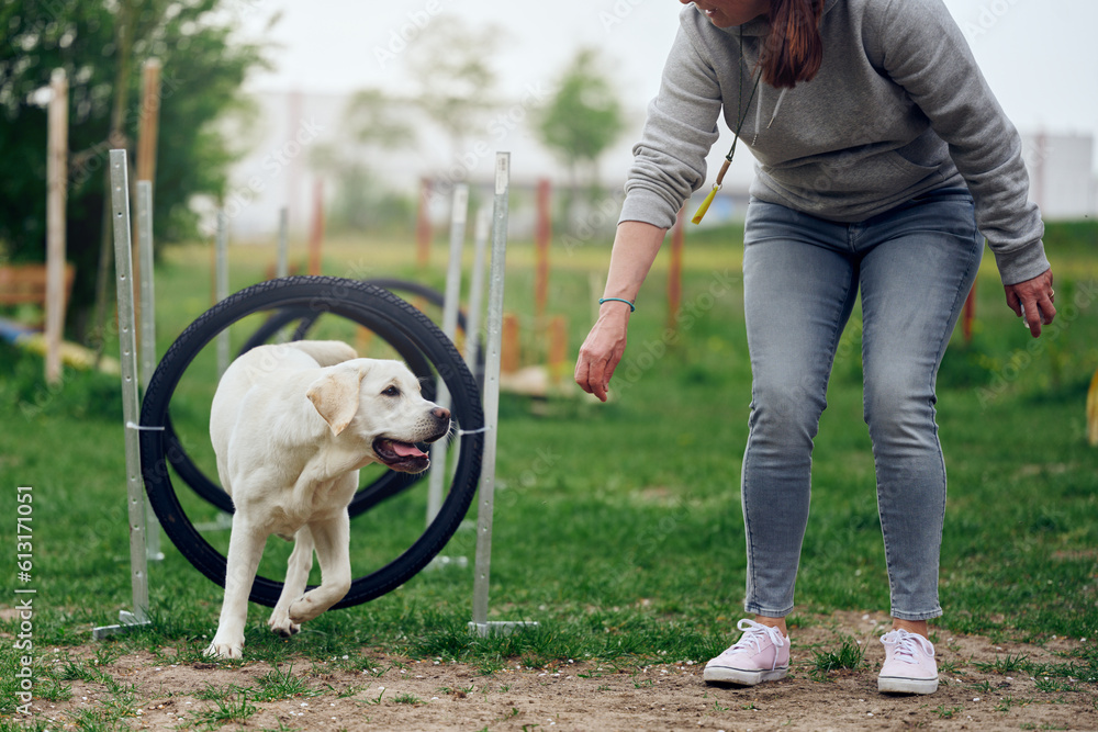 Woman mistress playing with her dog agility walking through rings or tires as an obstacle