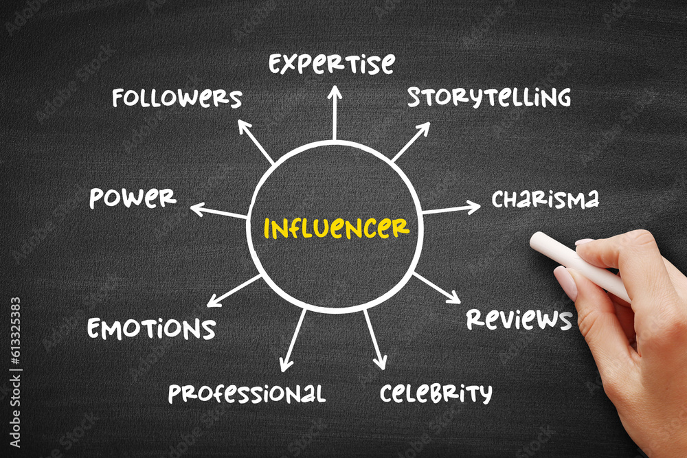 Influencer - person who can influence the decisions of their followers, someone in your niche or industry with sway over your target audience, mind map concept on blackboard