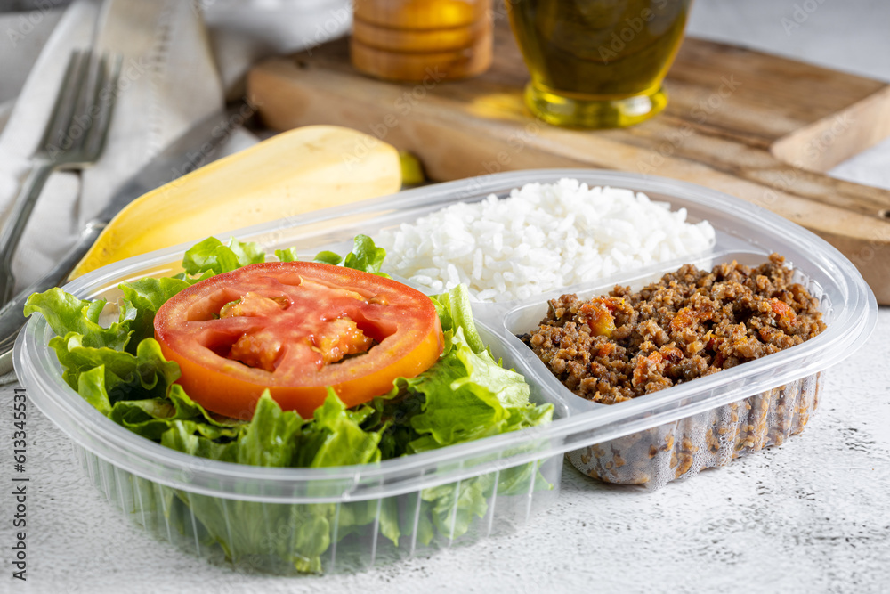Lunchbox with lettuce salad with tomato, rice and ground beef.