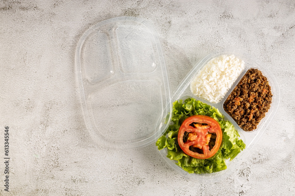 Lunchbox with lettuce salad with tomato, rice and ground beef.