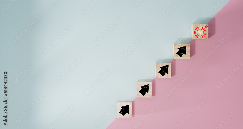 Virtual target board and arrow which print screen to wooden cube block on blue and pink background. Business achievement goal and objective target concept.