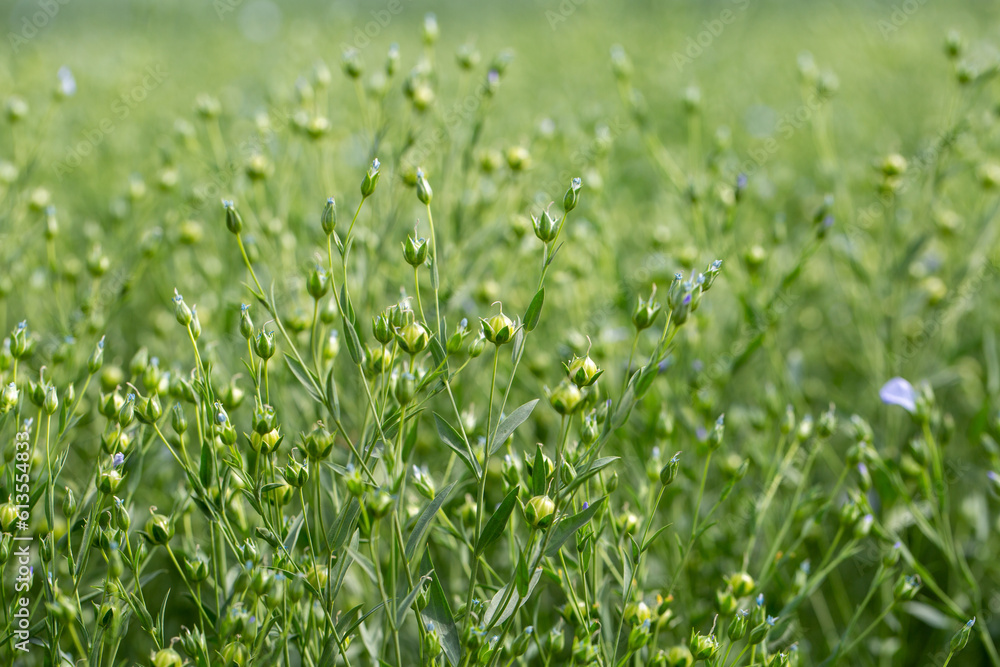 Green seed capsules of flax on the background of a green flax field