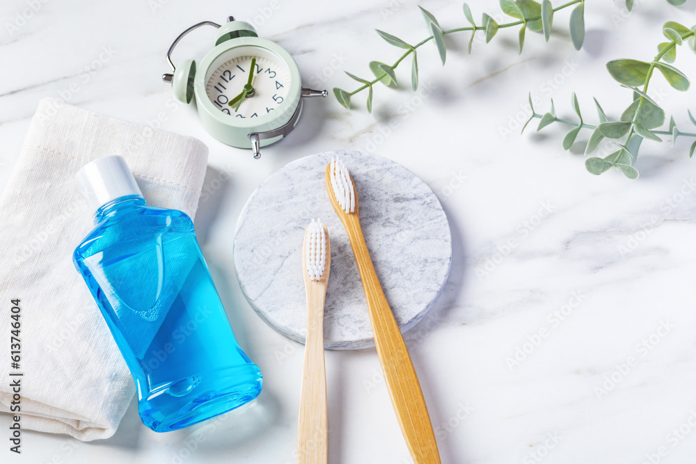 Oral health care product, bamboo toothbrush and mouthwash with clock on marble background