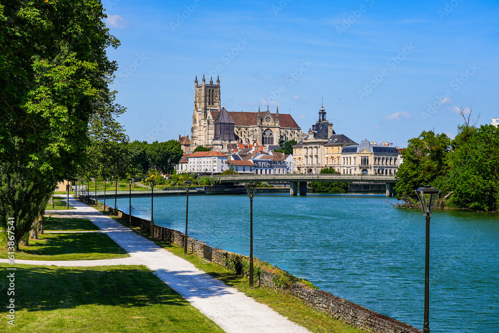 Saint Stephen Cathedral protruding above the Marne River as seen from the Jardin des Trinitaires ("Garden of the Trinitarians") in the French department of Seine et Marne near Paris, France