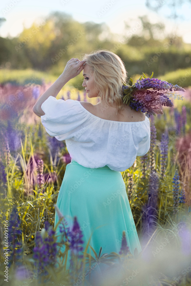 beautiful blond woman in white dress on lupin field summer background close up portrait