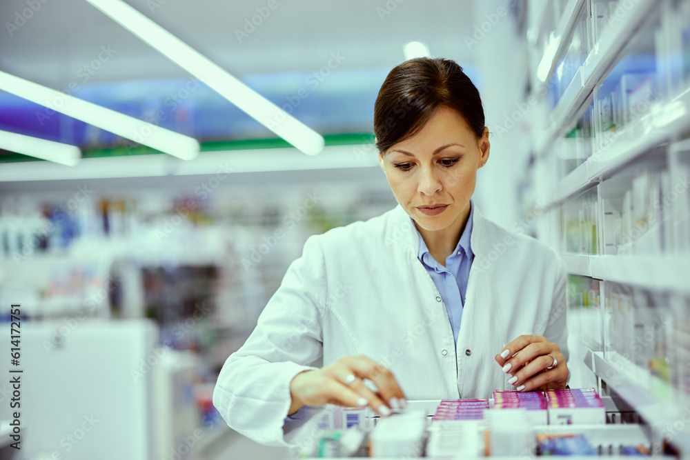 A female pharmacist arranges a medicine box on the shelves at the pharmacy.