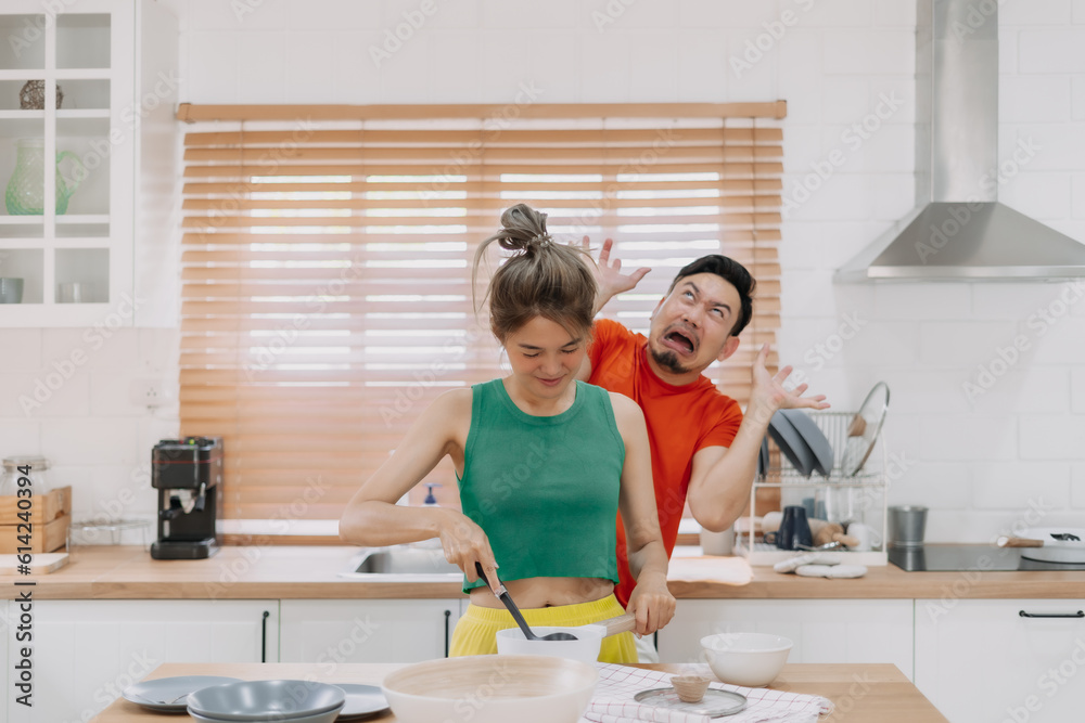 Asian couple, husband feels worry behind his wife while she is cooking for him.