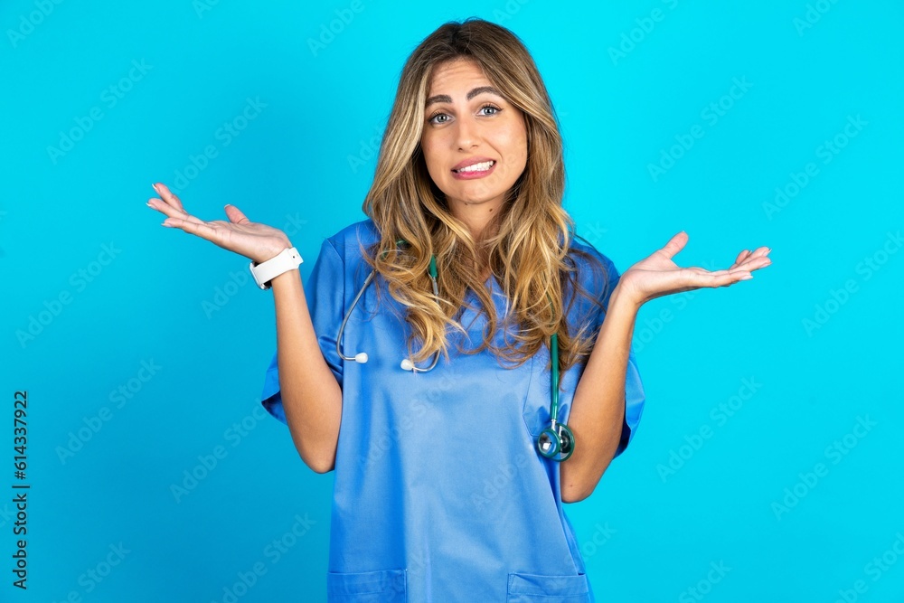 Clueless Young caucasian blonde doctor woman wearing blue uniform shrugs shoulders with hesitation, faces doubtful situation, spreads palms, Hard decision