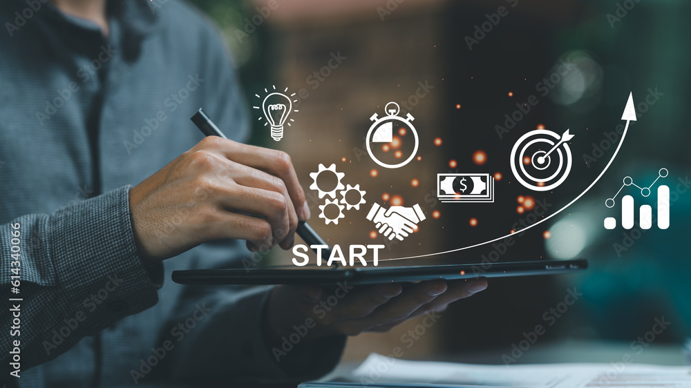 startup concept with icons business and network connection on modern virtual interface from digital tablet, holding pen touching tablet