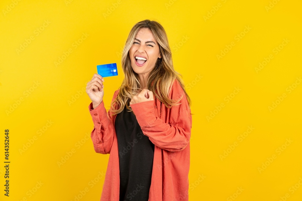 Excited happy positive cheerful smiling young beautiful blonde woman standing over yellow studio background hold credit card raise fist in victory