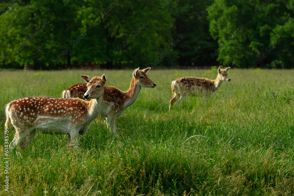 Group of three fallow deer in a field of green grass. Fallow of nara deer in spring..