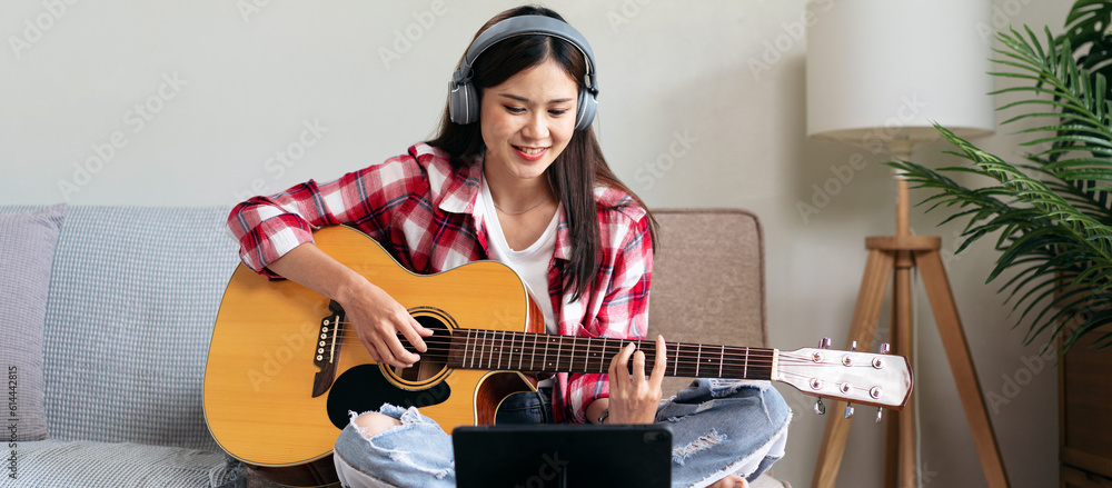 Young woman is playing guitar and practice to singing the song w