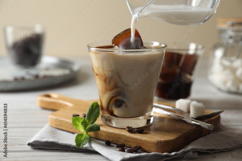 Pouring milk from jug into glass of delicious iced coffee, beans and mint on white wooden table