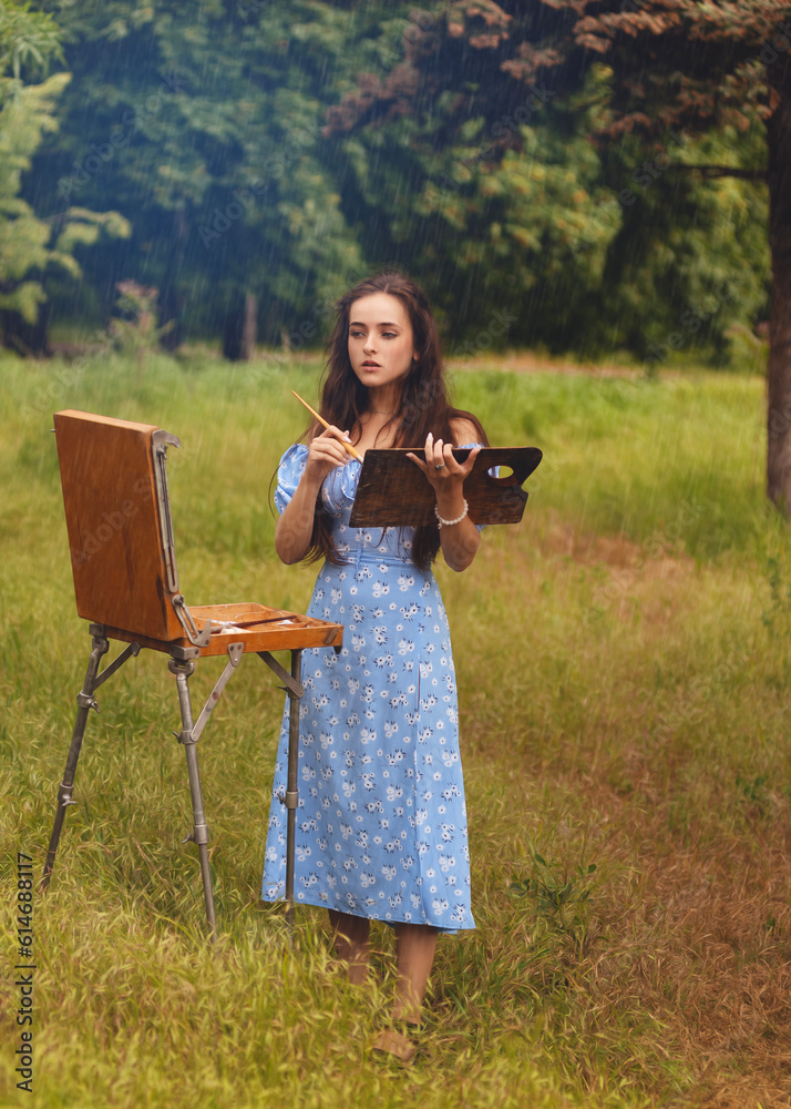 Beautiful young woman is relaxing while painting an art canvas outdoors in the park at rain.